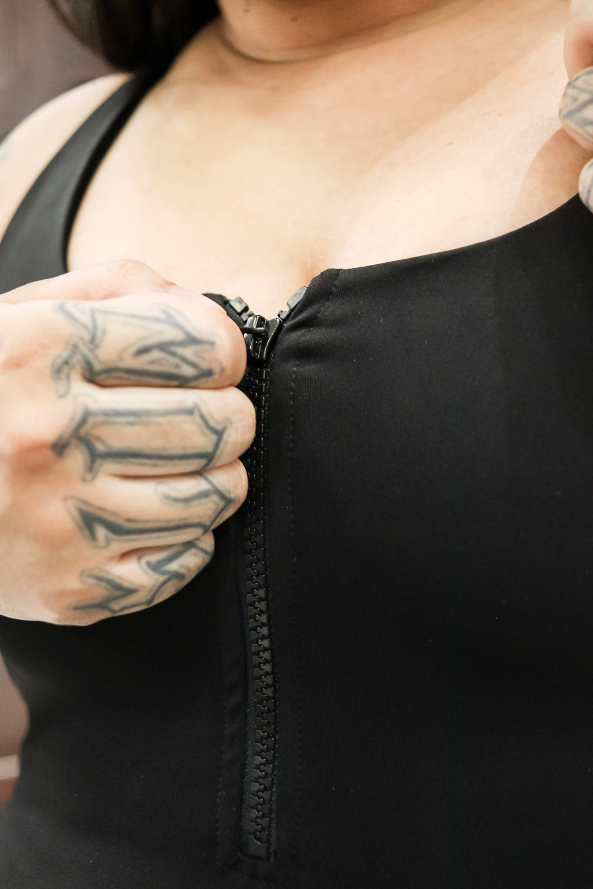 O design moderno com zíper frontal adiciona um toque de sofisticação e funcionalidade prática, facilitando o uso e criando um visual contemporâneo diferenciado. Disponível nas cores versáteis preto e cinza, esta peça única se adapta perfeitamente a qualquer ocasião, desde treinos intensos até atividades casuais do dia a dia.