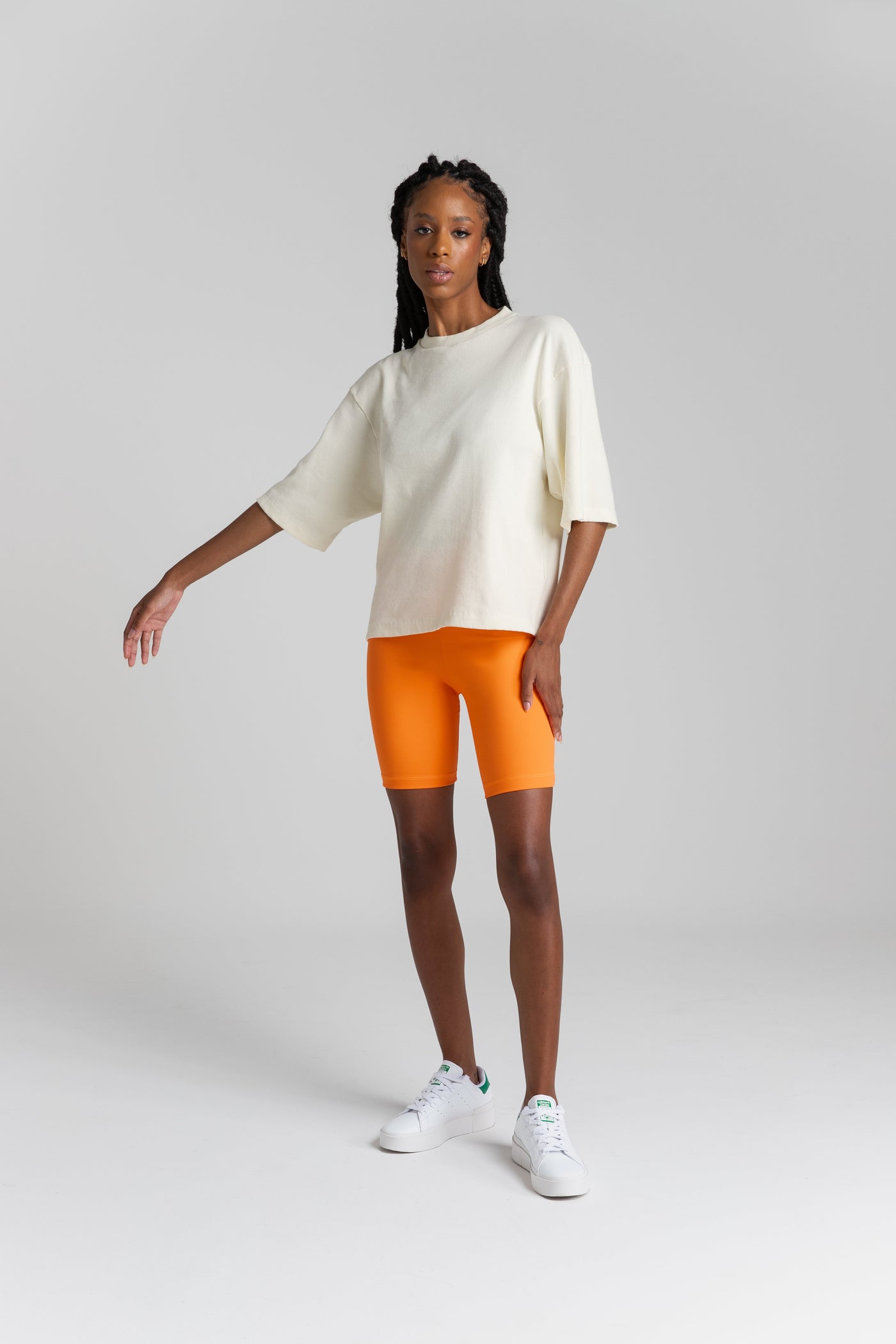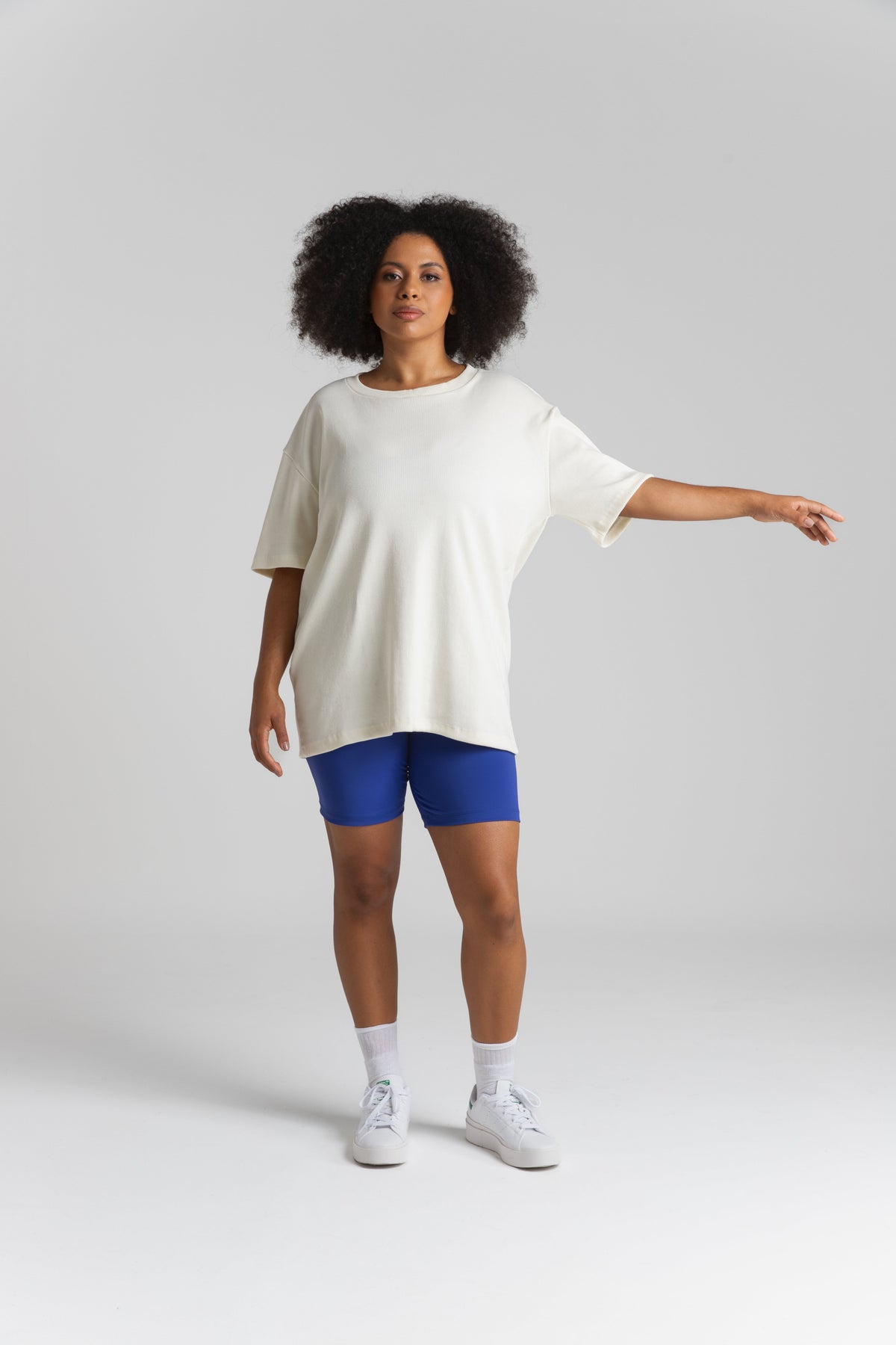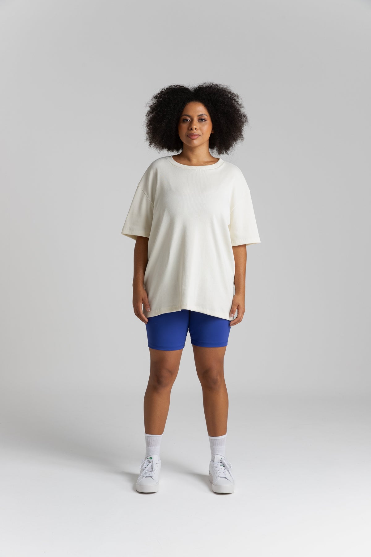 O tecido é encorpado, proporciona um caimento perfeito, enquanto a modelagem oversized oferece um toque contemporâneo. Os ombros deslocados e as mangas amplas adicionam um charme adicional, tornando esta camiseta uma escolha versátil para diversas ocasiões.